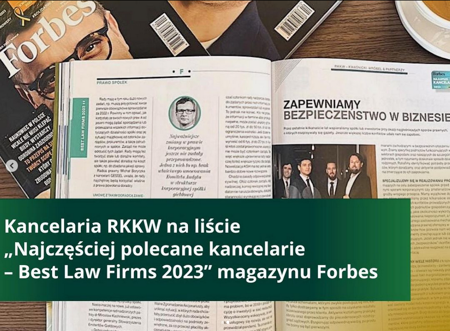 Zdjęcie przedstawiające RKKW - KWAŚNICKI, WRÓBEL I PARTNERZY, z sesji wykonanej na zlecenie AB CREATE w lutym 2023, zostało opublikowane w kwietniu 2023 roku w magazynie FORBES, prezentując firmę jako jedną z "Najczęściej polecanych kancelarii 2023".