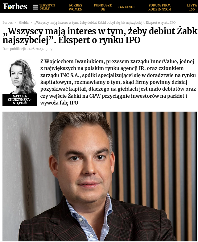 Zdjęcie CEO Wojciecha Iwaniuka z INNER VALUE, z sesji wykonanej na zlecenie AB CREATE we wrześniu 2022, zostało opublikowane w sierpniu 2023 roku w magazynie FORBES.