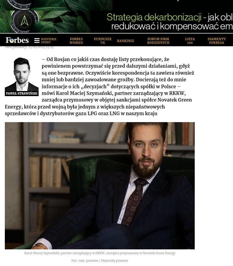 Zdjęcie Karola Szymańskiego z firmy RKKW - KWAŚNICKI, WRÓBEL I PARTNERZY, z sesji wykonanej na zlecenie AB CREATE w lutym 2023, zostało udostępnione online w magazynie FORBES we wrześniu 2023 roku.