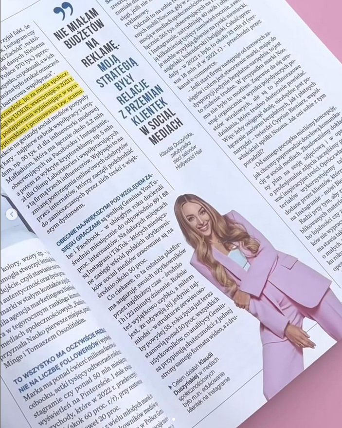Zdjęcie CEO Klaudii Duszyńskiej z HOLLYWOOD HAIR, z sesji wykonanej na zlecenie AB CREATE w grudniu 2021. Zostało opublikowane w czerwcu 2023 roku w magazynie FORBES ONLINE.